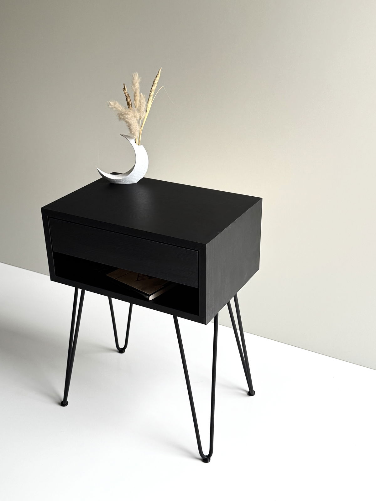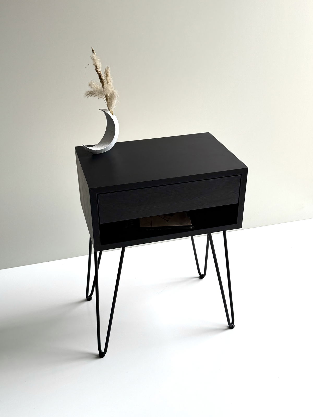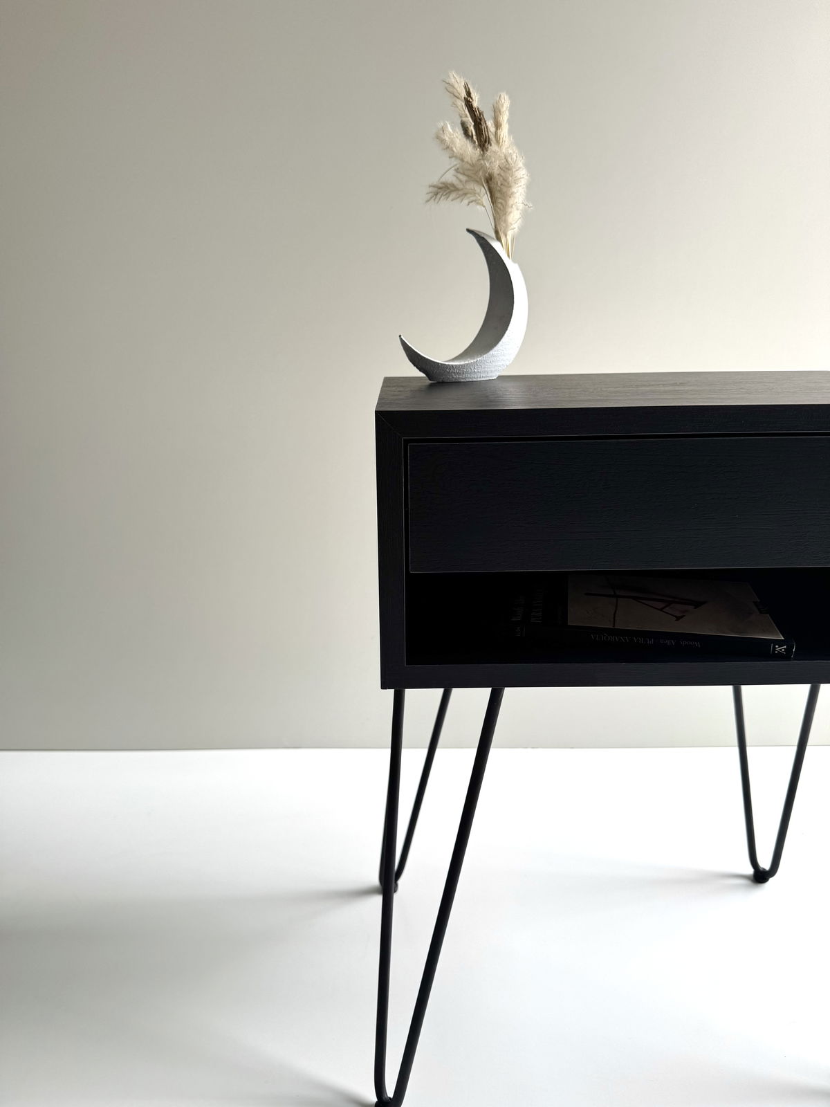 Fabricada en melamina MDF Negra con una suave textura de 18 mm, con uniones a 45° que logran una unión limpia y única, sin tornillos a la vista.