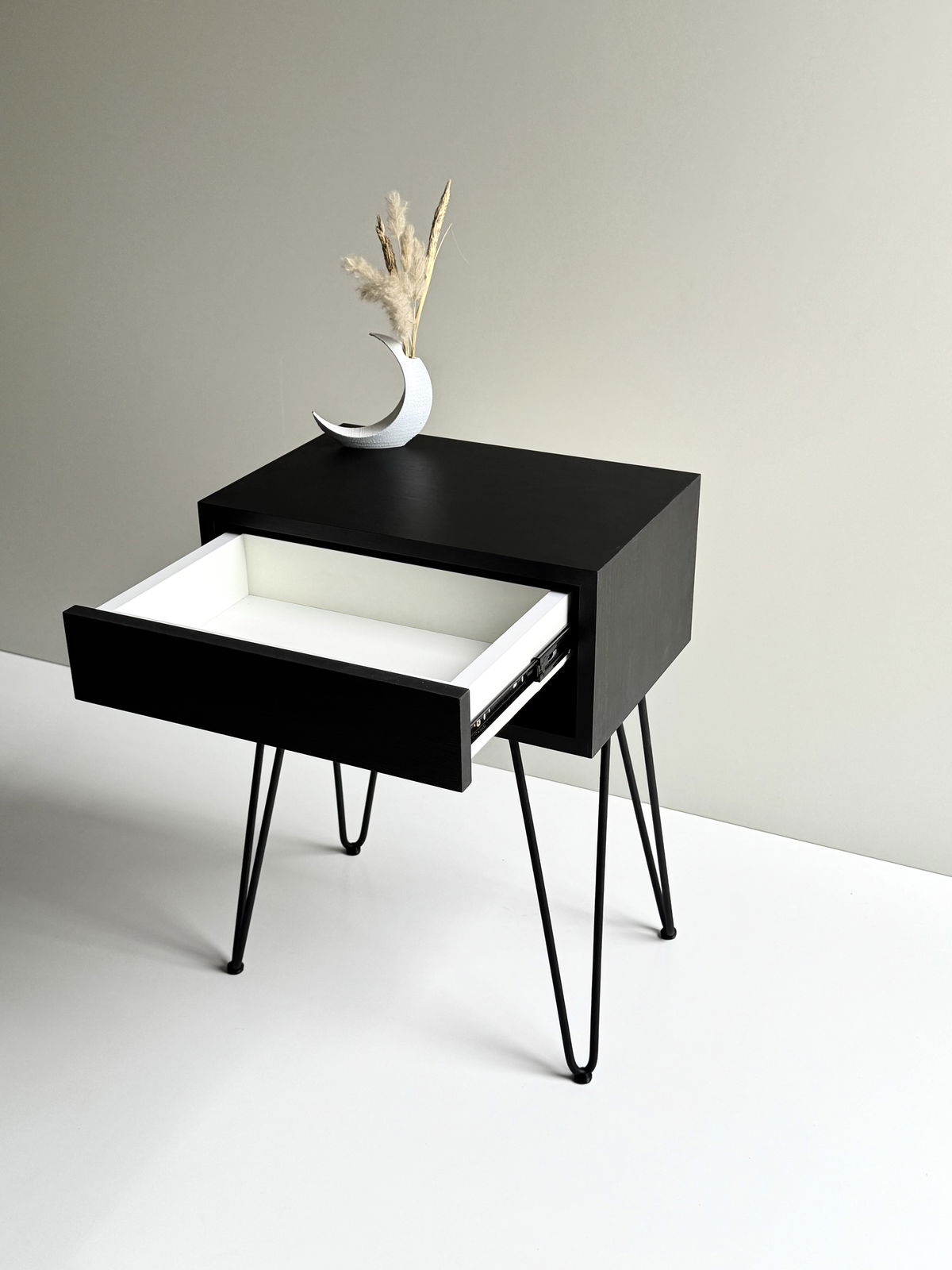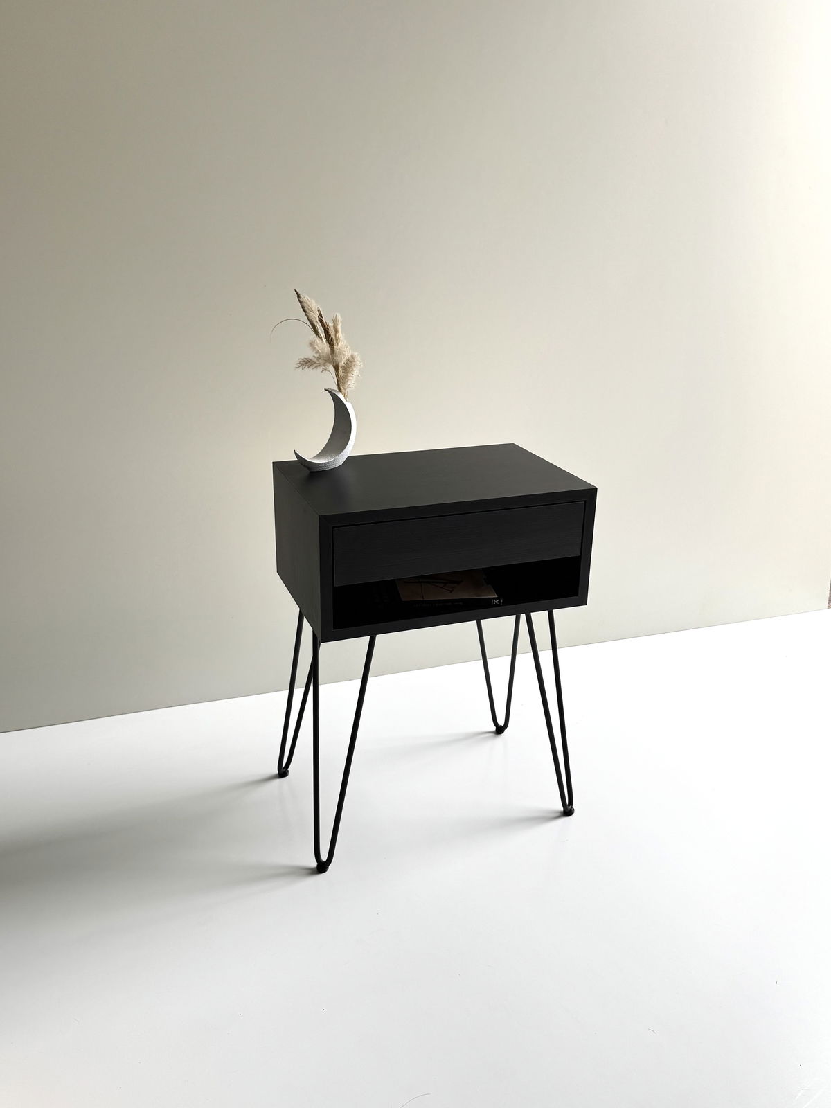 El paquete incluye: Estructura en melamina y cajón armados, 4 patas Hairpin y tornillos.